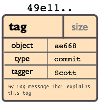 一个标签对象包括一个对象名(译者注:就是SHA1签名), 对象类型, 标签名, 标签创建人的名字("tagger"), 还有一条可能包含有签名(signature)的消息. 你可以用 git cat-file 命令来查看这些信息: