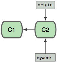 但是与此同时,有些人也在"origin"分支上做了一些修改并且做了提交了. 这就意味着"origin"和"mywork"这两个分支各自"前进"了,它们之间"分叉"了。