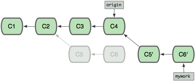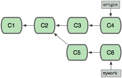 但是,如果你想让"mywork"分支历史看起来像没有经过任何合并一样,你也许可以用 git rebase:
