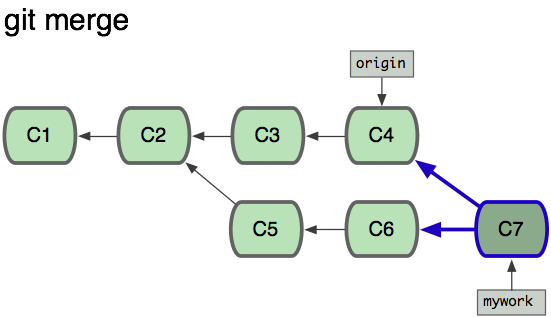 在这里,你可以用"pull"命令把"origin"分支上的修改拉下来并且和你的修改合并; 结果看起来就像一个新的"合并的提交"(merge commit):