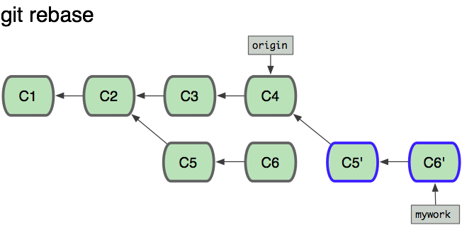 这些命令会把你的"mywork"分支里的每个提交(commit)取消掉,并且把它们临时 保存为补丁(patch)(这些补丁放到".git/rebase"目录中),然后把"mywork"分支更新 到最新的"origin"分支,最后把保存的这些补丁应用到"mywork"分支上。